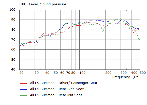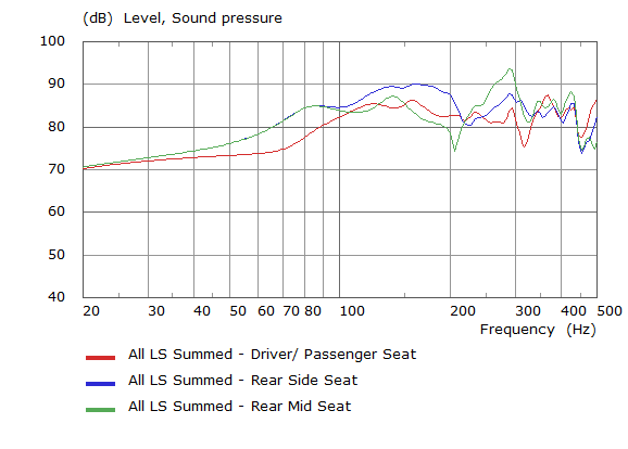 When all door loudspeakers are excited together, in phase without filtering, the response at each listener location appears to have consistent characteristics between the model and the experimental data. The front driver and passenger locations seem to be worse than the rear seats for bass response. The rear side seats are around 5dB louder from 100Hz to 200Hz than the other seating locations. The rear mid seat location also experiences a dip at ~200Hz and peaked response at 300Hz.