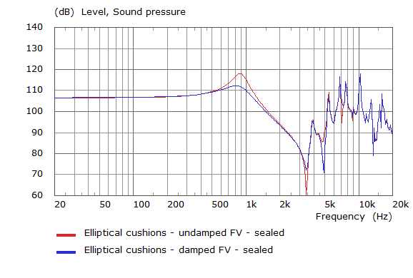 A similar result to the round enclosure case where the 900Hz resonance peak and following 2.4kHz dip become suppressed, along with some of the upper front enclosure resonances. Although the diaphragm separates the front and rear enclosures, the acoustic coupling may transfer some of the effects of the rear cavity resonances that are influenced by the frame vent damping.