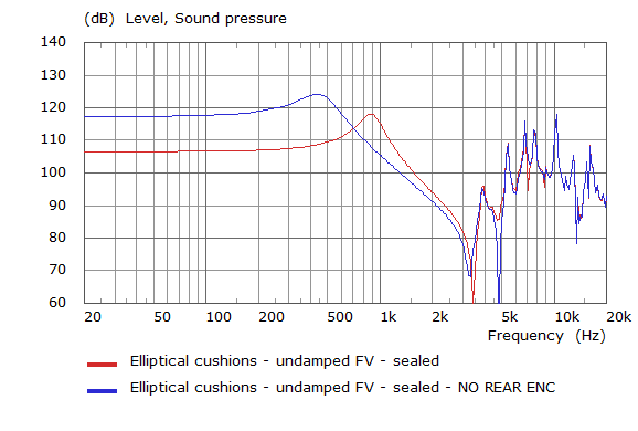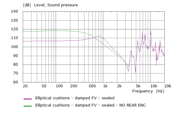 Starting with a complete headphone module, the effect of removing the rear enclosure and replacing with a baffled radiation condition, sampling SPL within the front volume with elliptical cushions