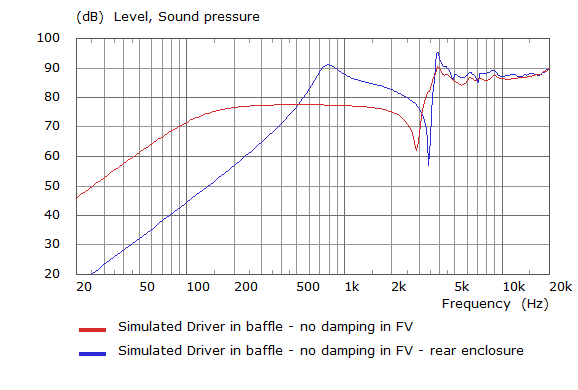 Above this, the frequency response appears identical, and the choppy behaviour that was observed in the undamped case without a rear enclosure has disappeared.