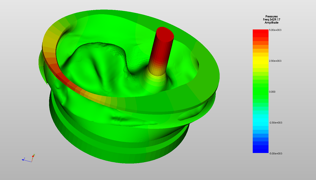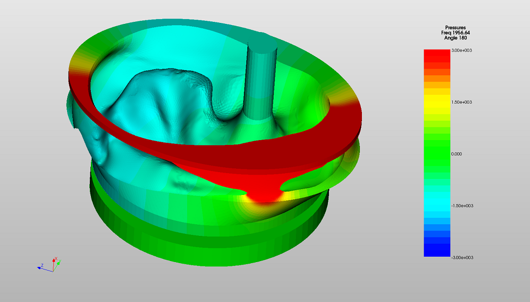 The effect of introducing this leak is, as observed in the earlier system analysis to create a roll off in the low frequency response. Additionally, it is interesting to see that the peak in the response at the ear canal resonance is also diminished and the disappearance of a sharp resonance effect at 2kHz which, as the acoustic phase contours below illustrate is a resonance set up in the cavity of air surrounding the ear. The leak effectively eliminates this resonance and it is unlikely that it will be observed experimentally.