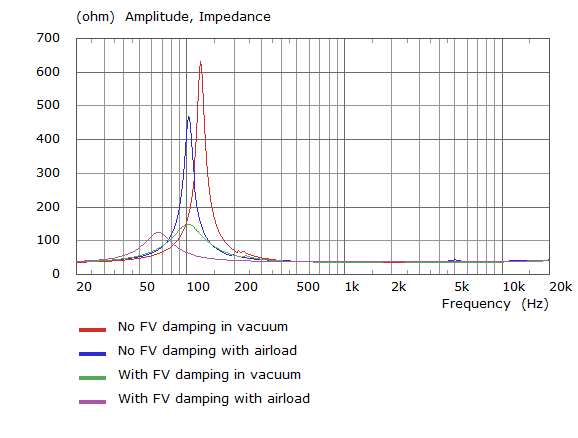 Damping in vents has major effect on electrical impedance resulting in a change in Zmax from 470 to 120 Ohms. To confirm that the frame damping is the cause of such a variation in ZMax, the driver was put into a vacuum chamber and electrical impedance measurements repeated. The idea was that if the airload could be removed, both the drivers should measure equivalently and any visco-thermal damping effects eliminated.