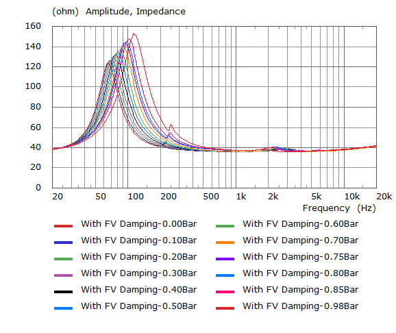 The difference in resonance frequencies and magnitude of Zmax between the drivers in the vacuum suggests that some residual airload exists. This was tested by pumping as much air as was safely possible from the chamber and making electrical impedance measurements as air was re-introduced. The initial value at -0.98 Bar has a resonance close to that of the driver wihout frame damping, though ZMax is much lower. The successive measurements as air was admitted produced a family of data (below) which might extrapolate to suggest a vacuum that would produce an equivalance between the drivers. It is believed that the change in resonance would be small, but the change in ZMax large at increased vacuum beyond the capability of the equipment.