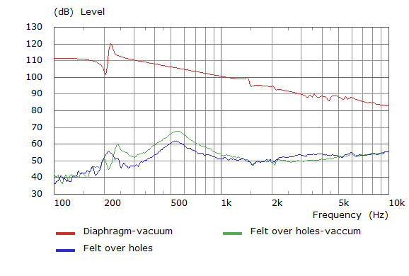The graph shows velocity spectra of the diaphragm and frame vent damping layer in the centre of a frame vent hole, when measured in a vacuum chamber. An additional measurement of the frame damping was taken when air was re-introduced to the chamber to observe the change. The velocity recorded on the frame damping is significantly less than that of the diaphragm, which is expected and there is a localised resonance at ~530Hz. In the air-loaded case, we can see that the frequency and magnitude of this resonance drops. It does not appear to follow the idea that air oscillating in the frame vents is causing mechanical resonance in the damping layer however, because air was removed which would surely reduce the resonance peak, not increase it.