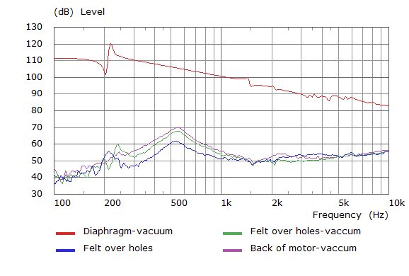 The 530Hz peak in velocity remains in the data when the rear of the motor is measured. This is understood to be a mechanical resonance of the driver frame itself, driven by the harmonic Lorentz force developed in the motor, when the frame is restrained at the outer edge.